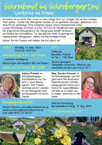 Inmitten der Weingärten werden wir mit gezielten Übungen, spielerisch und ohne Druck, großartige Texte entstehen lassen. Die angenehme Atmosphäre in der Kleingruppe von 6 bis 10 TeilnehmerInnen schafft Vertrauen und fördert den Schreibfluss. Für das leibliche Wohl ist gesorgt.